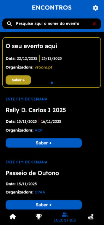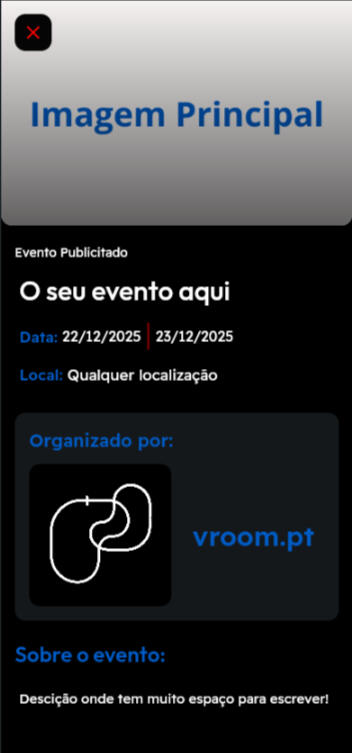 Dentro do Vroom.pt é possível publicitar 2 tipos de evento, as Corridas e os Encontros.Dentro das Corridas apenas existe um plano. Este é destinado a organizadoras que até já tenham o evento na app, mas querem destacá-lo, e a organizadoras que ainda não o têm publicado. As organizadoras têm vários campos para preencher, como o nome, o local, a data, várias imagens, uma descrição, etc...Dentro dos Encontros, são muito semelhantes às Corridas. Porém aqui existem 2 planos diferentes, um com mais destaque, e outro com menos.Se clicar no botão a baixo irá perceber melhor como tudo isto funciona!